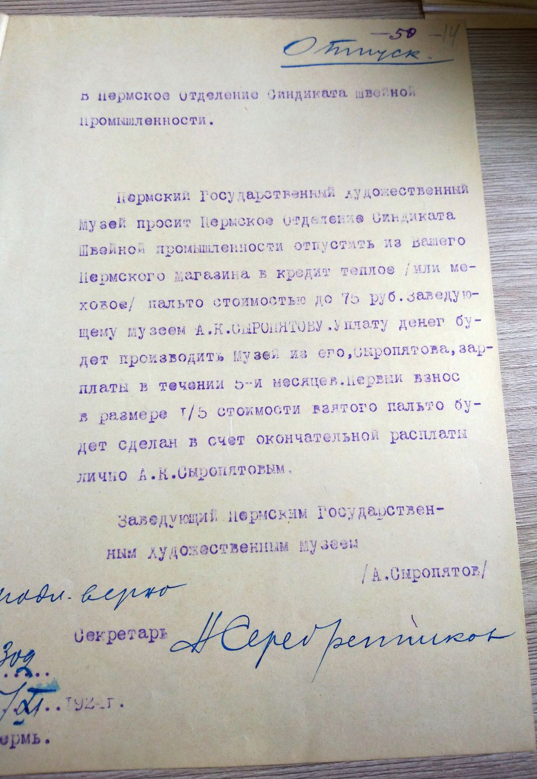 «Пермский Государственный художественный Музей просит Пермское Отделение Синдиката Швейной промышленности отпустить из вашего Пермского магазина в кредит тёплое /или меховое/ пальто стоимостью до 75 руб. заведующему музеем А.К. Сыропятову. Уплату денег будет производить музей из его, Сыропятова, зарплаты в течении 5-и месяцев. Первый взнос в размере 1/5 стоимости взятого пальто будет сделан в счёт окончательной расплаты лично А.К. Сыропятовым».