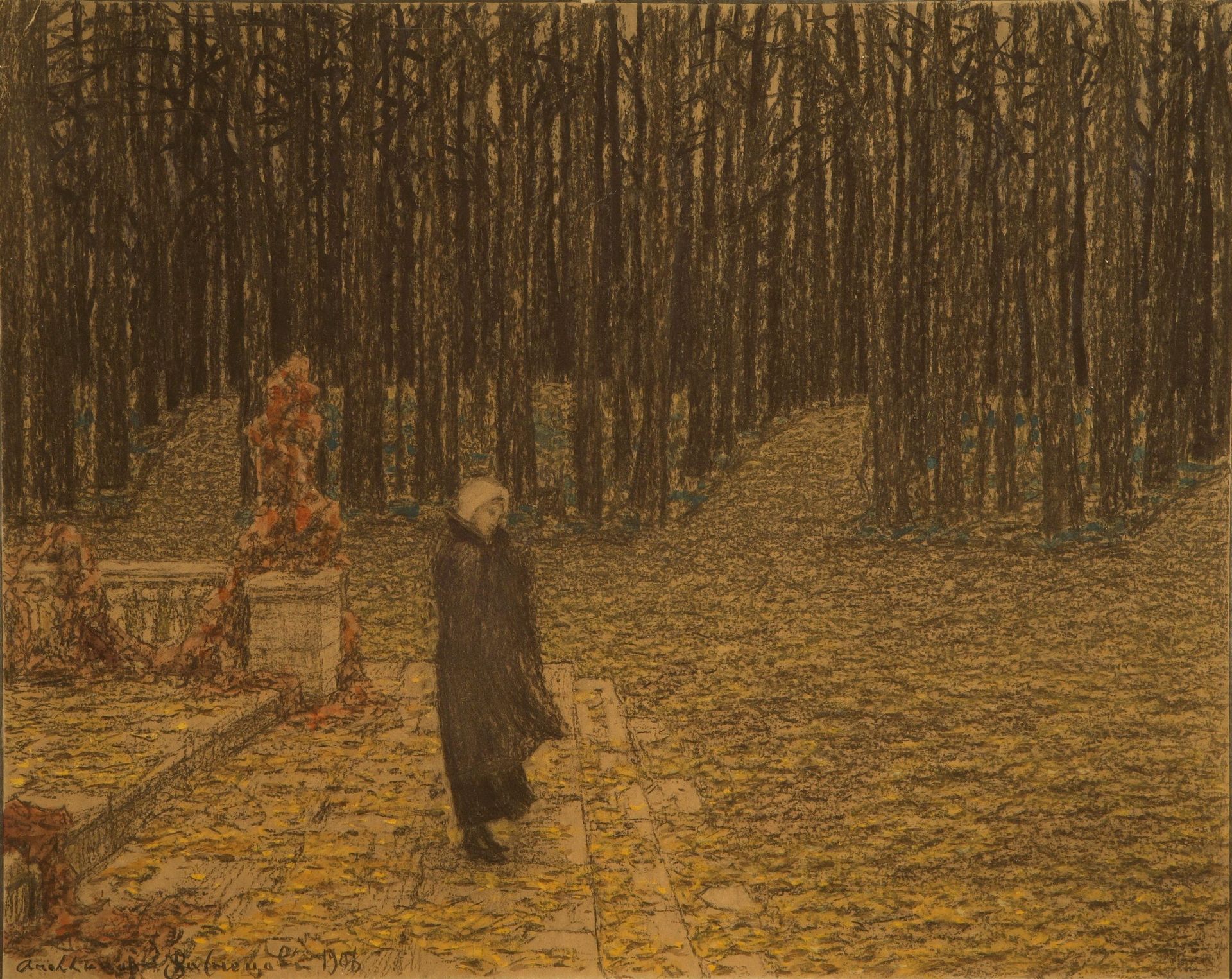 А он в целости и сохранности! Зинаида Морозова-Рейнбут, вдова и наследница Саввы Морозова, обставляла и украшала усадьбу по своему вкусу, она-то и превратила её в образец дворянской ампирной усадьбы. Известно, что произведения искусства она приобретала прямо из мастерских художников, так что рисунок «Осень. Прощание с парком», скорее всего, был приобретён в мастерской Васнецова.