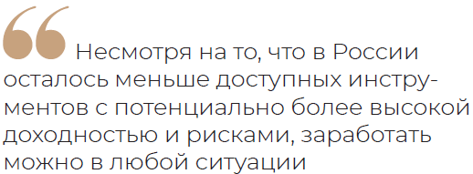 Несмотря на то, что в России осталось меньше доступных инструментов с потенциально более высокой доходностью и рисками, заработать можно в любой ситуации, считает финансовый аналитик Виктор Тунёв. «Рынки работают, возможности для инвесторов остаются. Другой вопрос, что у многих поменялись приоритеты и снизилось доверие к финансовым инструментам», — говорит он.