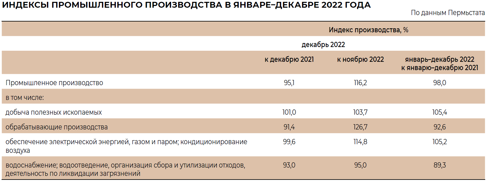 Индекс производства по промышленным видам экономической деятельности в Пермском крае в январе—декабре 2022 года по сравнению с аналогичным периодом прошлого года составил 98%. Об этом сообщает Пермьстат.