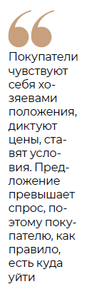 Это мнение поддерживает и Алексей Терентьев, но, по его мнению, особенно сильно это заметно на рынке вторичной недвижимости. По его словам, здесь наблюдается отчётливая разница между «ценой рекламы» и «ценой сделки» — фактически недвижимость продаётся значительно дешевле, чем заявлено в рекламе. Покупатели чувствуют себя хозяевами положения, диктуют цены, ставят условия. Предложение превышает спрос, поэтому покупателю, как правило, есть куда уйти. Особенно с учётом низких (по отношению ко вторичной недвижимости) ипотечных ставок на новостройки.