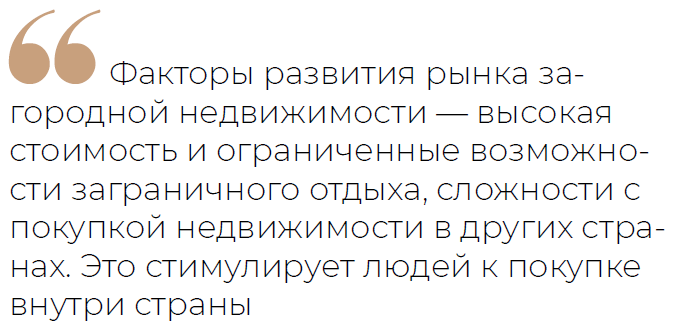 Несколько факторов развития рынка называет Екатерина Черепанова: это высокая стоимость и ограниченные возможности заграничного отдыха, сложности с покупкой недвижимости в других странах. Это стимулирует людей к покупке земельных участков или готовых загородных объектов внутри страны.