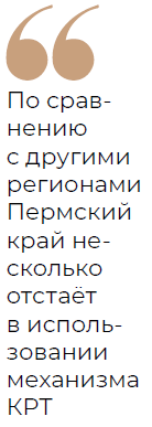 Однако по сравнению с другими регионами Пермский край несколько отстаёт в использовании механизма КРТ. В целом по стране, по данным Минстроя РФ на конец февраля 2023 года, подготовлено 335 проектов решений о КРТ, опубликовано 253 проекта решений, начата реализация КРТ в отношении 260 территорий.