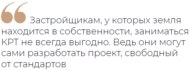 «Застройщикам, у которых земля находится в собственности, заниматься КРТ не всегда выгодно. Ведь они могут сами разработать проект, свободный от стандартов. Мы можем видеть примеры комплексной застройки, включающие детский сад, спортивные и детские площадки и прочую инфраструктуру и по своей сути близкие к КРТ, но формально им не являющиеся», — говорит эксперт.