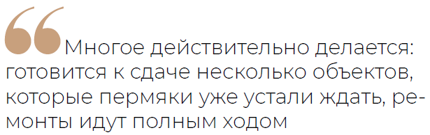 Нужно отметить, что многое действительно делается: готовится к сдаче несколько объектов, которые пермяки уже устали ждать, ремонты идут полным ходом. Камская набережная заметно похорошела — это прекрасно. Краеведов порадовало включение в программу возведения здания второй сцены ТЮЗа: на месте бывшего «Дома крестьянина» (а ещё раньше здесь, на ул. Пермской, 66, находилось первое здание Мариинской женской гимназии) появится красивое и столь необходимое для любимого театра строение. Пусть и новодел, но всё же квартал будет интересный.
