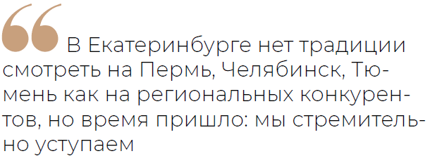В Екатеринбурге нет традиции смотреть на Пермь, Челябинск, Тюмень как на региональных конкурентов, но время пришло: мы стремительно уступаем. Пора увидеть, что вообще-то далеко не так всё хорошо, как мы привыкли о себе говорить.