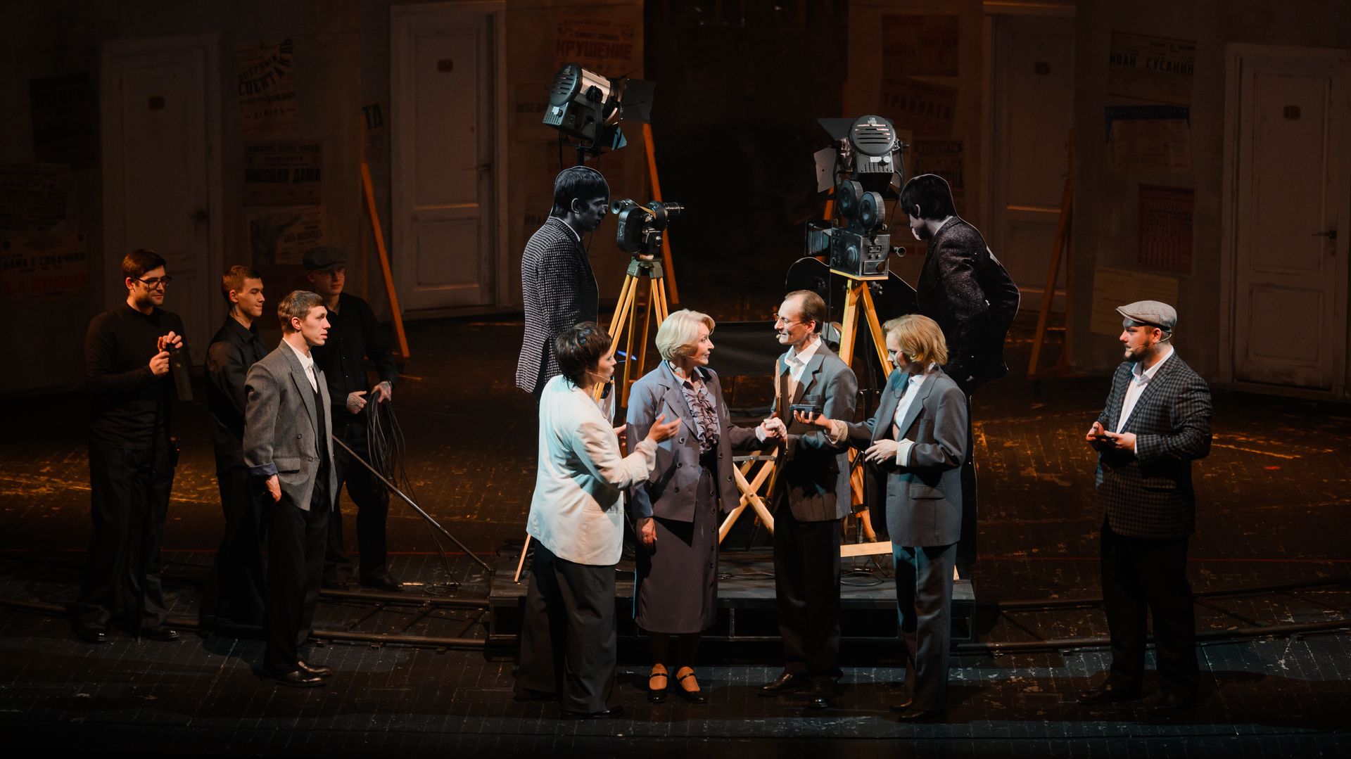 Зал смеётся и легко подхватывает эту игру, чувствуя театральную условность, а с появлением странного персонажа начинается путешествие во времени: из 1965 года в наши дни, когда съёмочная бригада занимается производством фильма о 1965 годе, а потом в новогодний вечер 1942-го…