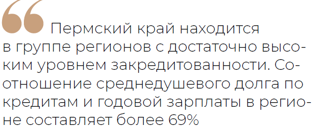 По данным рейтинга, Пермский край находится в группе регионов с достаточно высоким уровнем закредитованности. Соотношение среднедушевого долга по кредитам и годовой зарплаты в регионе составляет более 69%. Средний объём задолженности перед банками на одного человека составляет в Прикамье 375 тыс. руб. За год этот показатель увеличился на 27 тыс. руб. В целом составители рейтинга присвоили региону 68-е место из 85 (регионы отсортированы от наименее закредитованных к более закредитованным).
