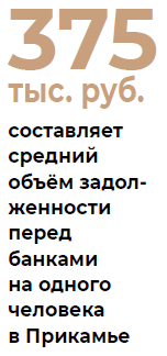 Среди лидеров по уровню закредитованности находятся регионы Сибири: Новосибирская область (отношение среднедушевой банковской задолженности к годовой зарплате составляет 79%), Тюменская область (83%), Республика Тыва (99%), а также Республика Адыгея (80%), Удмуртия (82%). Единственный регион в стране, где средний долг по кредитам превышает годовую зарплату, — это Калмыкия, там показатель долговой нагрузки составляет 109%.