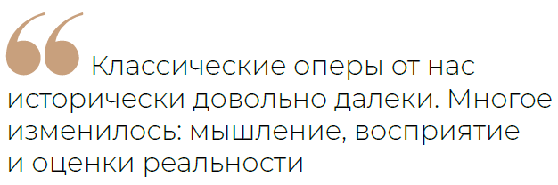 — Надо помнить, что классические оперы от нас исторически довольно далеки. Многое изменилось: мышление, восприятие и оценки реальности, и, чтобы сделать эти сюжеты понятными для современного зрителя, оперные режиссёры приближают сюжет и музыку к личному зрительскому опыту. Режиссёрская опера цепляет зрителя не только тем, что звучит классическая музыка и прекрасные голоса, а ещё и пониманием, в связи с чем эта музыка звучит и о чём говорят эти голоса. Либретто, написанное 100 или 200 лет назад, это слишком далеко от нас, невозможно это всё воспроизводить в том виде, в котором это было написано, и воспринимать всерьёз. И да, действительно, подчас либретто были написаны совсем не великими писателями.