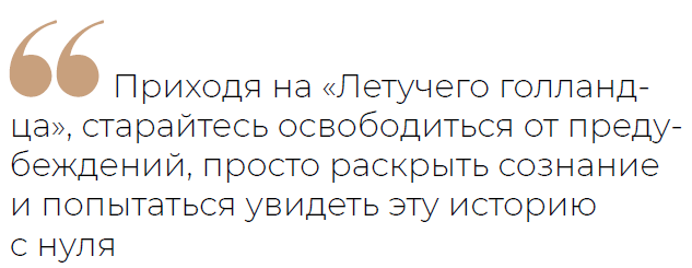 — Моё пожелание не только пермскому, но и любому зрителю: приходя на «Летучего голландца», старайтесь освободиться от предубеждений, просто раскрыть сознание и попытаться увидеть эту историю с нуля. Мы ничего не изменили в сюжете, просто надо освободиться от внутренних шор и читать текст, который будет в титрах, — он объясняет, что происходит.