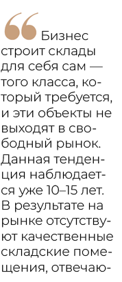 По словам Дмитрия Ончурова, самый высокий спрос отмечается на склады класса А: площадью не менее 30 тыс. кв. м, высотой не менее 4—6 м, желательно с кран-балкой, а также на земельные участки, подходящие для строительства таких площадей.