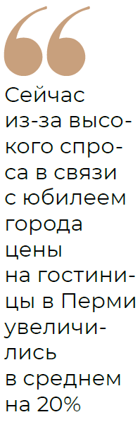 Как следствие, в гостиницах Перми долгое время не менялась стоимость размещения и иногда она была ниже, чем в других городах-миллионниках. Однако сейчас из-за высокого спроса в связи с юбилеем города цены на пермском рынке увеличились в среднем на 20%, констатирует Иван Норин. «Скорее всего, сейчас соотношение цены и качества менее адекватное, чем было раньше, потому что все отельеры, почувствовав увеличение спроса, так или иначе подняли цены. В других городах-миллионниках на данный момент нет событийных мероприятий подобного масштаба, поэтому там средняя стоимость номера увеличилась примерно на процент инфляции», — говорит он.