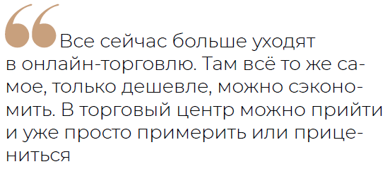 «Да и в целом, все сейчас больше уходят в онлайн-торговлю. Там всё то же самое, только дешевле, можно сэкономить. В торговый центр можно прийти и уже просто примерить или прицениться», — говорит она.