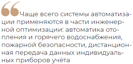 Директор компании Research & Decisions Регина Давлетшина отмечает, что чаще всего системы автоматизации применяются в части инженерной оптимизации: автоматика отопления и горячего водоснабжения, пожарной безопасности, дистанционная передача данных индивидуальных приборов учёта. Об этом, как правило, потребитель не знает, но получает ощутимую выгоду.