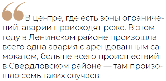 Статистику дорожно-транспортных происшествий с начала сезона 2023 года привёл начальник отделения пропаганды ГИБДД Перми Владимир Яцук. Он рассказал, что в центре, где есть зоны ограничений, аварии происходят реже. В этом году в Ленинском районе произошла всего одна авария с арендованным самокатом, больше всего происшествий в Свердловском районе — там произошло семь таких случаев.