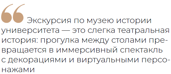 Экскурсия по музею истории университета — это слегка театральная история: прогулка между столами превращается в иммерсивный спектакль с декорациями и виртуальными персонажами. Главные герои нарисованы в виде силуэтов на экранах из оргстекла, ограничивающих каждую из тематических инсталляций. Их автор — дизайнер экспозиции Пётр Стабровский, один из ведущих пермских художников и сын первого директора музея. Такая вот преемственность.