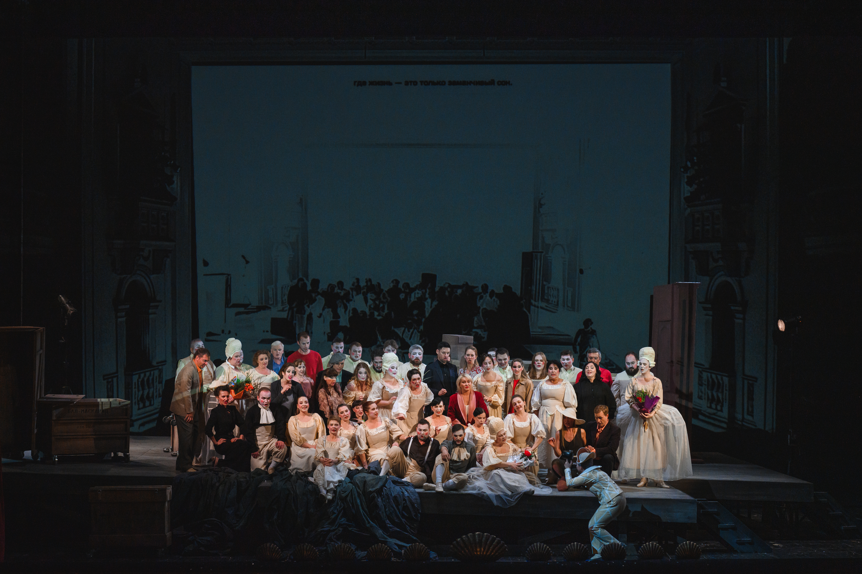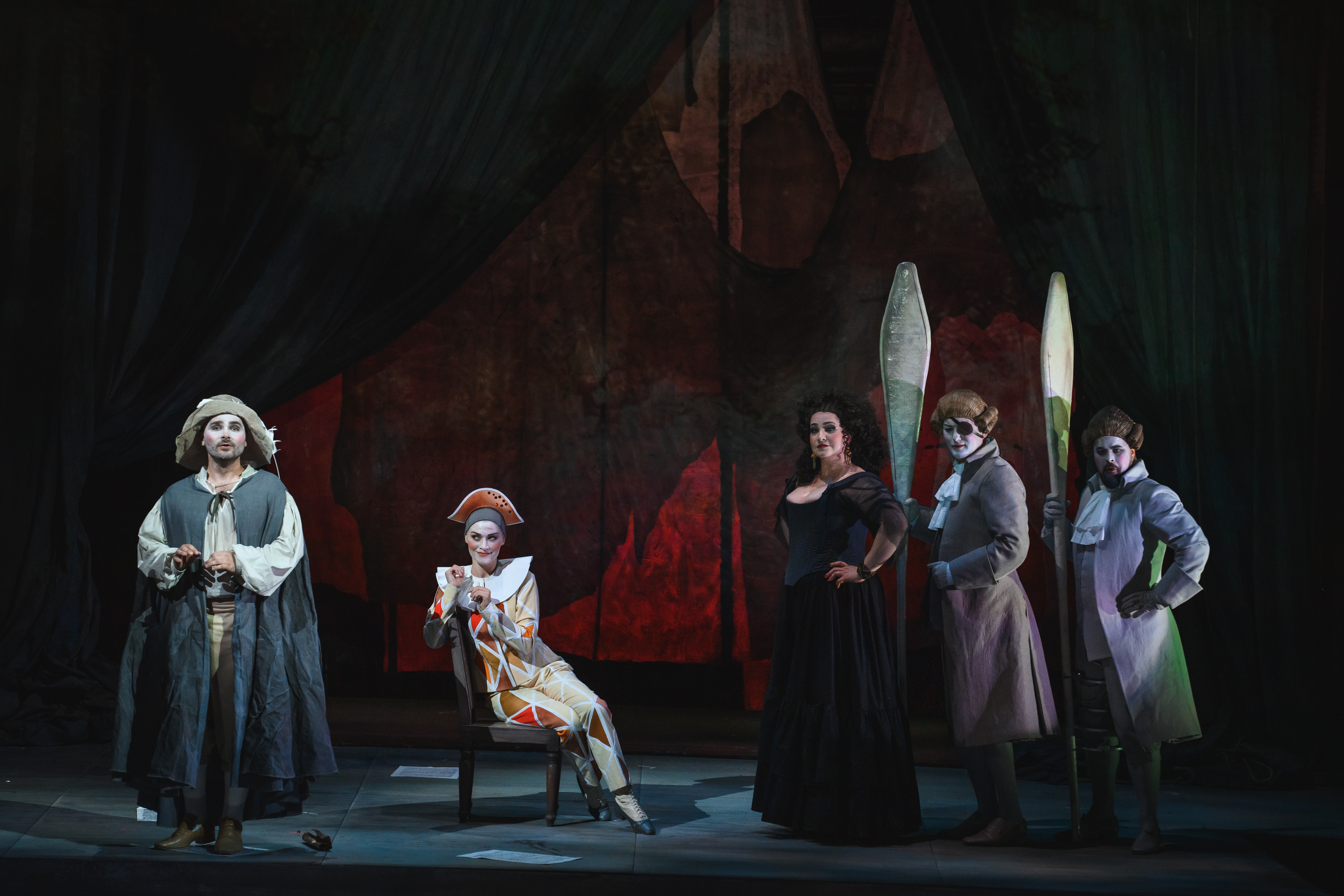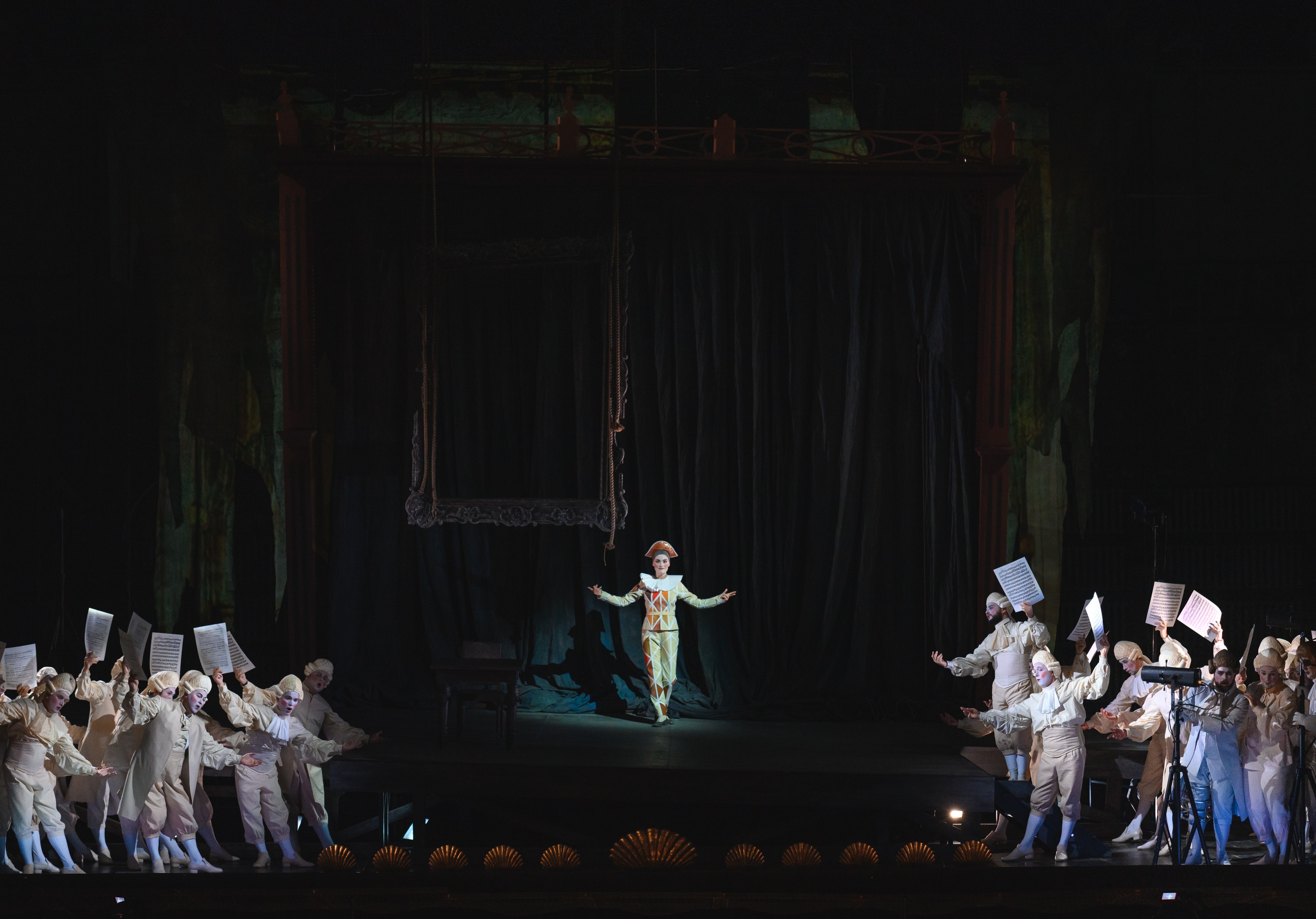 Финал «Бала-маскарада» окончательно переводит рассказанную в либретто Эжена Скриба трагедию в формат той разновидности площадного театра, в котором, как в блоковском «Балаганчике», вместо крови стекает клюквенный сок. Длинные и забавные поклоны — это шутовские похороны Риккардо, который, выходя из роли, приподнимается, чтобы приветствовать зрителей, и тут же снова «умирает» («Умерла так умерла», помните?), а цветы, полученные от поклонников, с преувеличенной торжественностью укладываются вокруг почтенного «трупа».