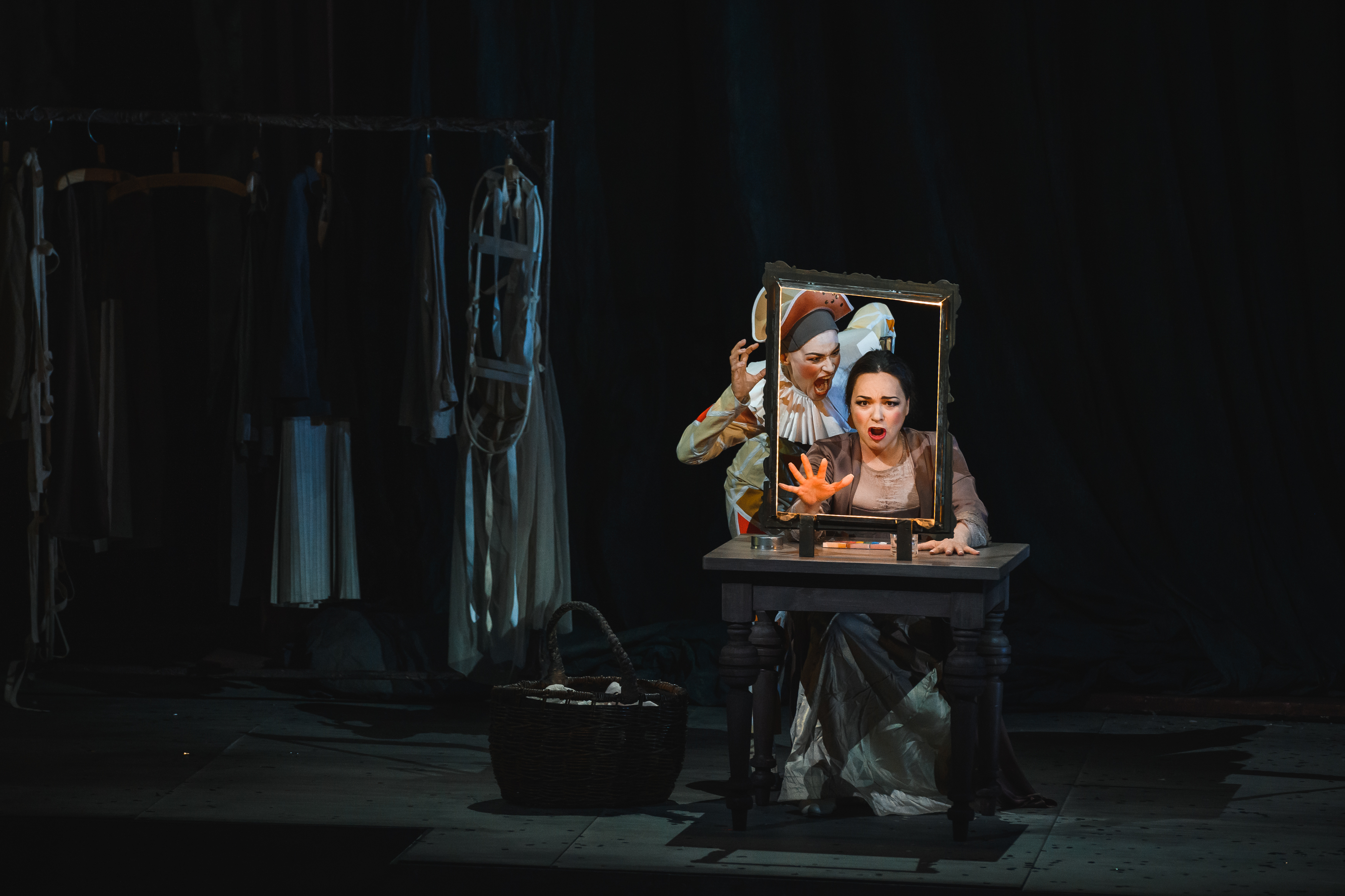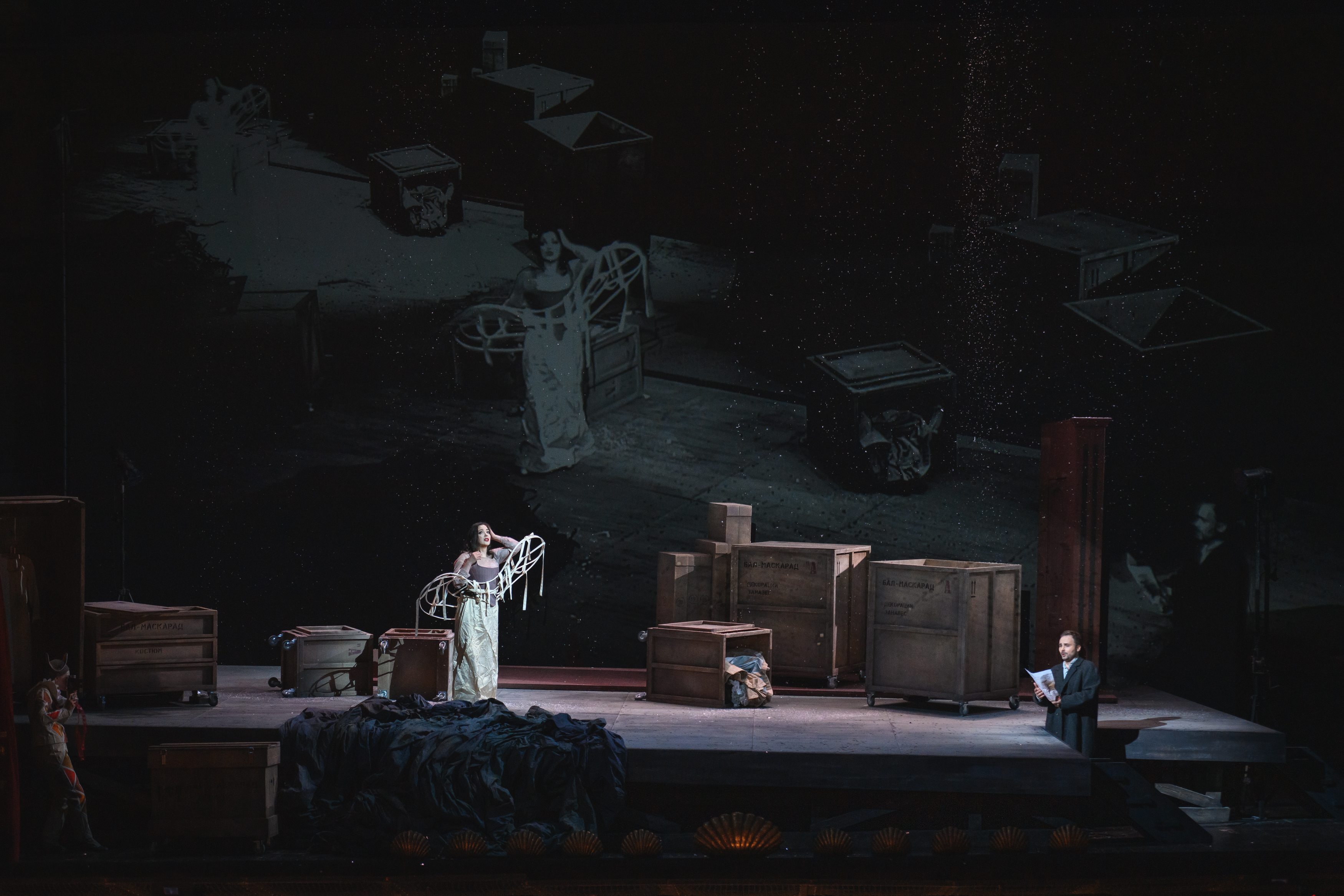 Театр и реальность не то чтобы объединяются, а как бы путаются. В традиционной опере живая жизнь пронизана театральностью, замещена ею; в современных постановках очень часто эту жизнь пытаются вернуть в оперный сюжет — переносят действие в современность, добавляют политическую и социальную актуальность. У Наставшевса — наоборот: если жанр — ветхий и престарелый, то почему бы не превратить это в постановочный приём? «Умерла так умерла» — это ироничное высказывание верно и по отношению к старой итальянской опере, и, как выяснится позже, по отношению к персонажам спектакля.