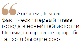 Алексей Дёмкин — фактически первый глава города в новейшей истории Перми, который не проработал хотя бы один срок. Не могу сказать, что на своём посту он делал что-то сверхъестественное или инновационное, то, что не делали до него. Сам по себе экс-градоначальник обладает прекрасным свойством — вызывать эмпатию, умеет прекрасно общаться и располагать собеседников к себе.