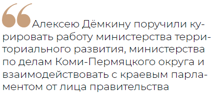 На выездном заседании кабмина Прикамья в Нытве 28 июня губернатор Дмитрий Махонин представил Алексея Дёмкина как нового вице-премьера краевого правительства. Ему поручили курировать работу министерства территориального развития и министерства по делам Коми-Пермяцкого округа в регионе и взаимодействовать с краевым парламентом от лица правительства.