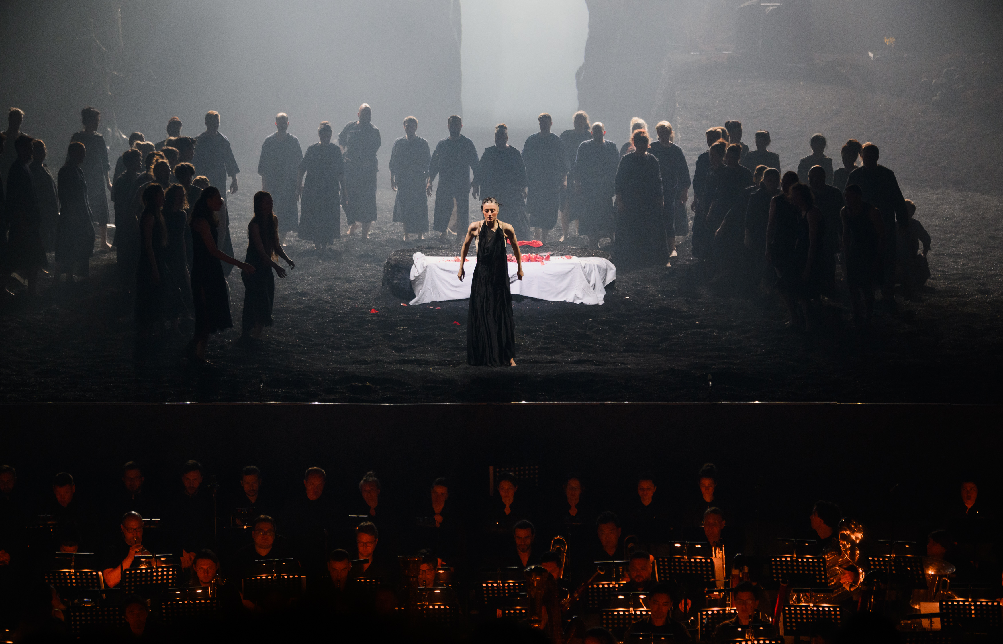 Спектакль Гусевой сознательно и расчётливо погружает сознание в архаичное переживание обряда Элевсинских мистерий. Казалось, древние звуки и ритмы летят из прошлого в наше настоящее откуда-то из древних Микен, из тьмы веков, когда борьба света и порядка с предвечным Хаосом и первородным мраком только начиналась. Главной функцией магов и жрецов в архаических обществах было заклясть древнее Зло, запечатать его обрядами и ритуалами, отвратить катастрофу. В наше время театр пытается заместить жреческие функции, воздействуя на действительность посредством музыки, танца, пения, ритма; это имеет под собой некоторые основания: искусство в первобытные времена было рождено обрядом, выросло из обрядовых действий и до сих пор отчасти сохраняет свои магические суггестивные свойства как некую потенциальную возможность иррационального управления реальностью. Полагаю, Теодор Курентзис во многом повлиял на концепцию спектакля: с присущим ему визионерством он, наверняка, полагает, что может воздействовать на реальность, подчинив её своей творческой воле.