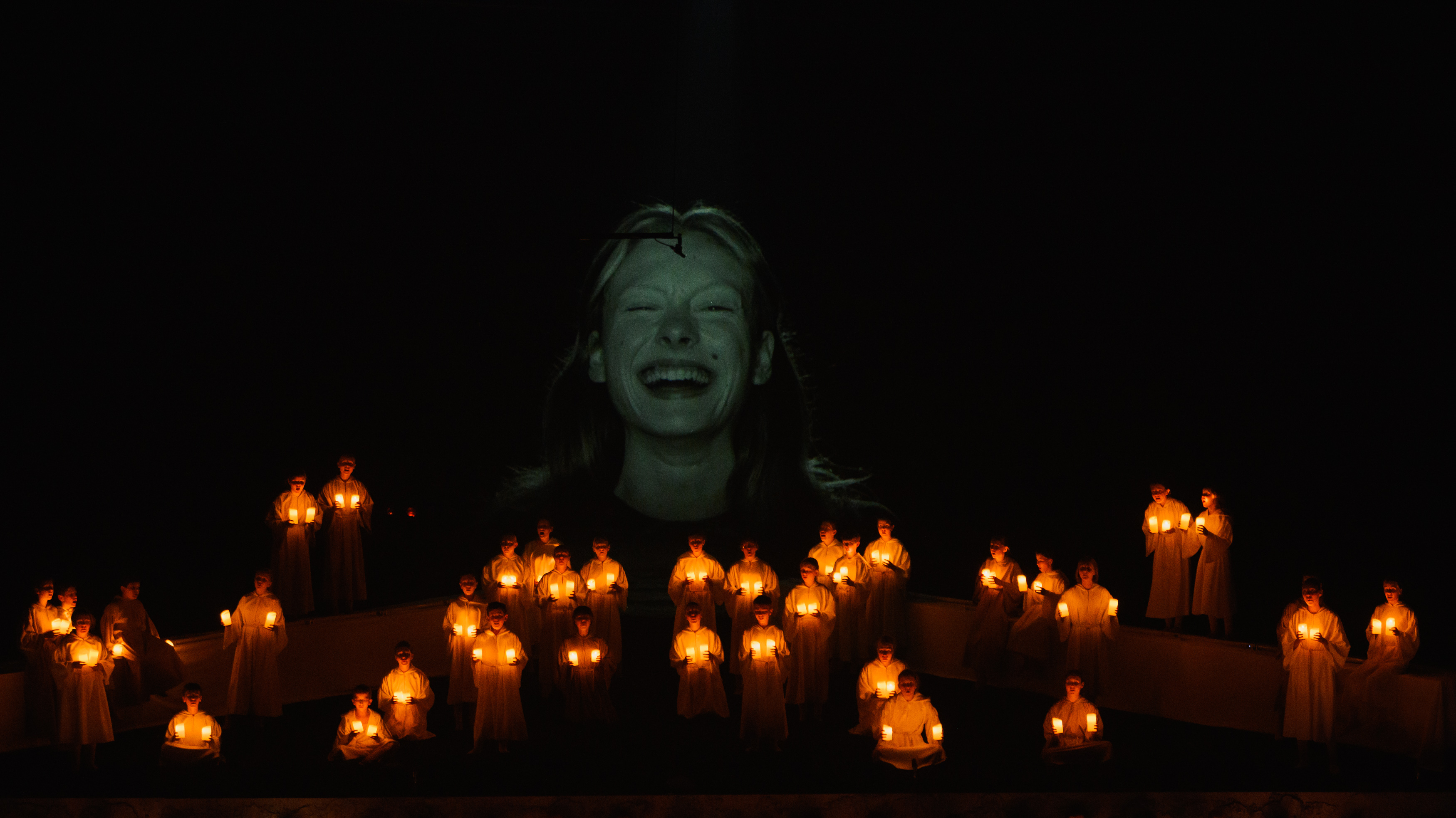 Анна Гусева не стала искусственно притягивать к этой музыке сюжет, но поставила «Симфонию» как череду живых картин: за двумя длинными столами, составленными углом, сидят мальчики и девочки в белых туниках, держа в руках свечи: тёплый жёлтый свет освещает их юные лица, застылые мизансцены с выразительными жестами рук напоминают о Тайной вечере. В центре на большом экране поминутно меняются лица: старые и молодые, мужские и женские. Девичьи черты расплываются, превращаясь в мужские, мимические гримасы горя, печали, радости, надежды создают эмоциональный контрапункт к звучащей музыке.