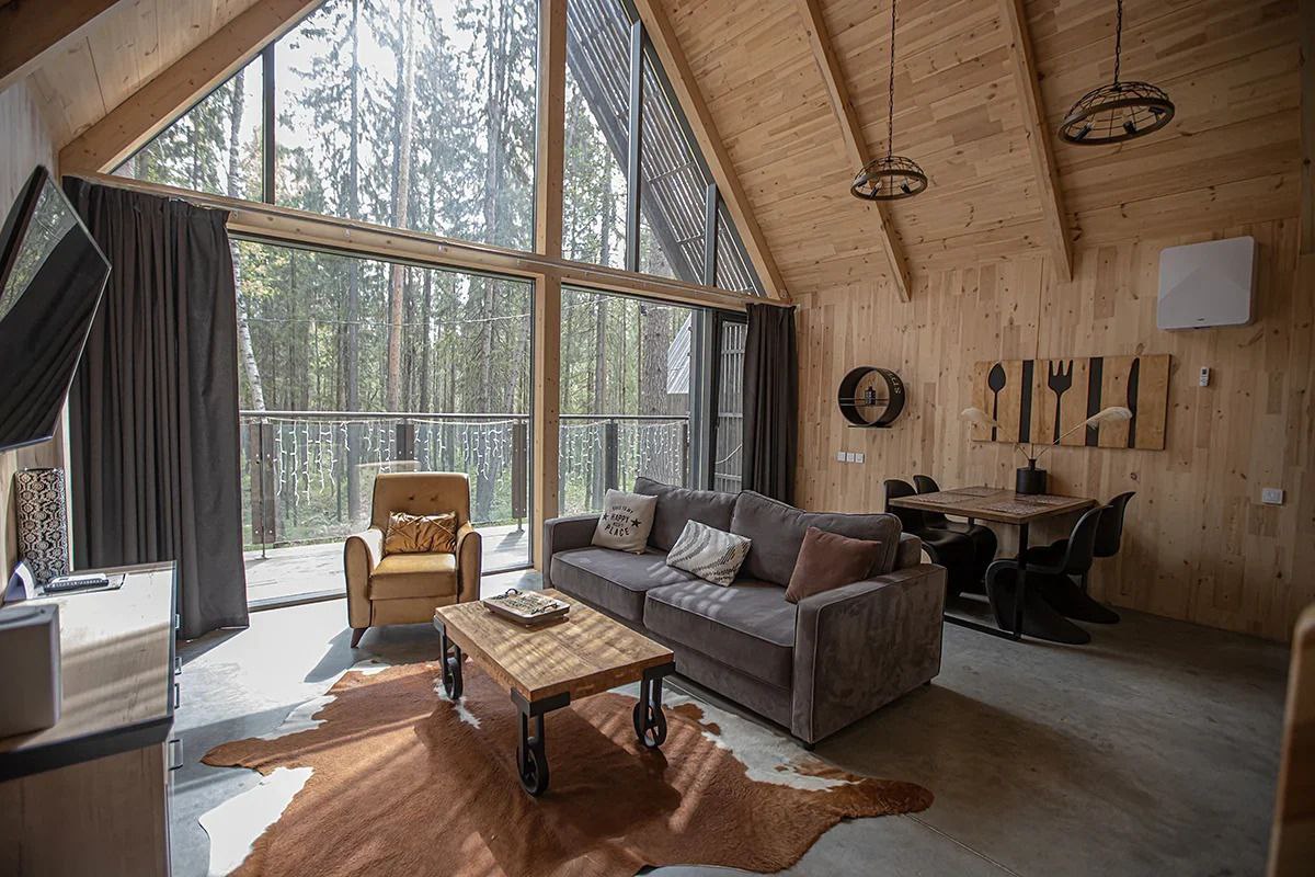 Когда мы задали нашему архитектору Андрею Мордину вопрос: а что, если конёк крыши приподнять? «Можно сделать антресольную спальню», — ответил Мордин. После этого появились «Дом Авиатора», который сделан в авиационном стиле (там лампы в виде вертолётов), «Лофт» и «Алиса» — та, что в Стране чудес — с приподнятыми крышами. Площадь фундамента у них такая же, как у одноэтажных домов, но получается дополнительная спальня, и в таком домике можно разместить до шести человек. Одна стена в экодоме полностью стеклянная; человек просыпается и видит со второго этажа лес — птички поют, белки и зайцы бегают… Особенно здорово весной.