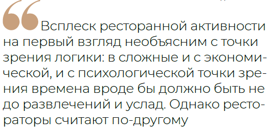 Всплеск ресторанной активности на первый взгляд необъясним с точки зрения логики: в сложные и с экономической, и с психологической точки зрения времена вроде бы должно быть не до развлечений и услад. Однако рестораторы считают по-другому.