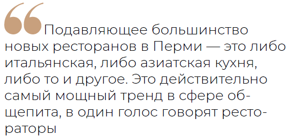 — Конечно, всегда будет востребована незыблемая классика: котлеты, пельмени, картошка и супы, но сегодня в моде авторская кухня и азиатские проекты — их очень любят пермяки. Японская и итальянская кухни переживают новый виток популярности. Японская — в основном в формате доставки по городу; новые заведения японской кухни с посадочными местами не открываются, зато качественной доставки довольно много. Италия популярна как быстрый стартап: макароны и пицца — это ведь продажа теста, она очень маржинальна.