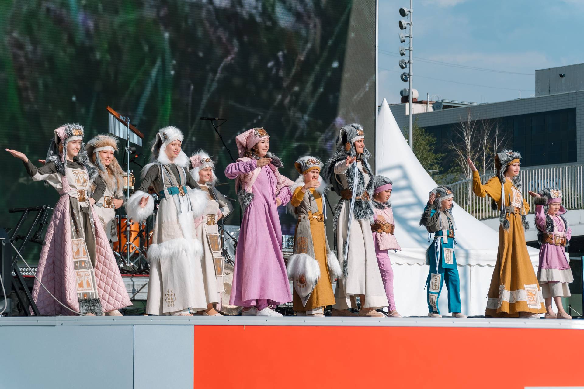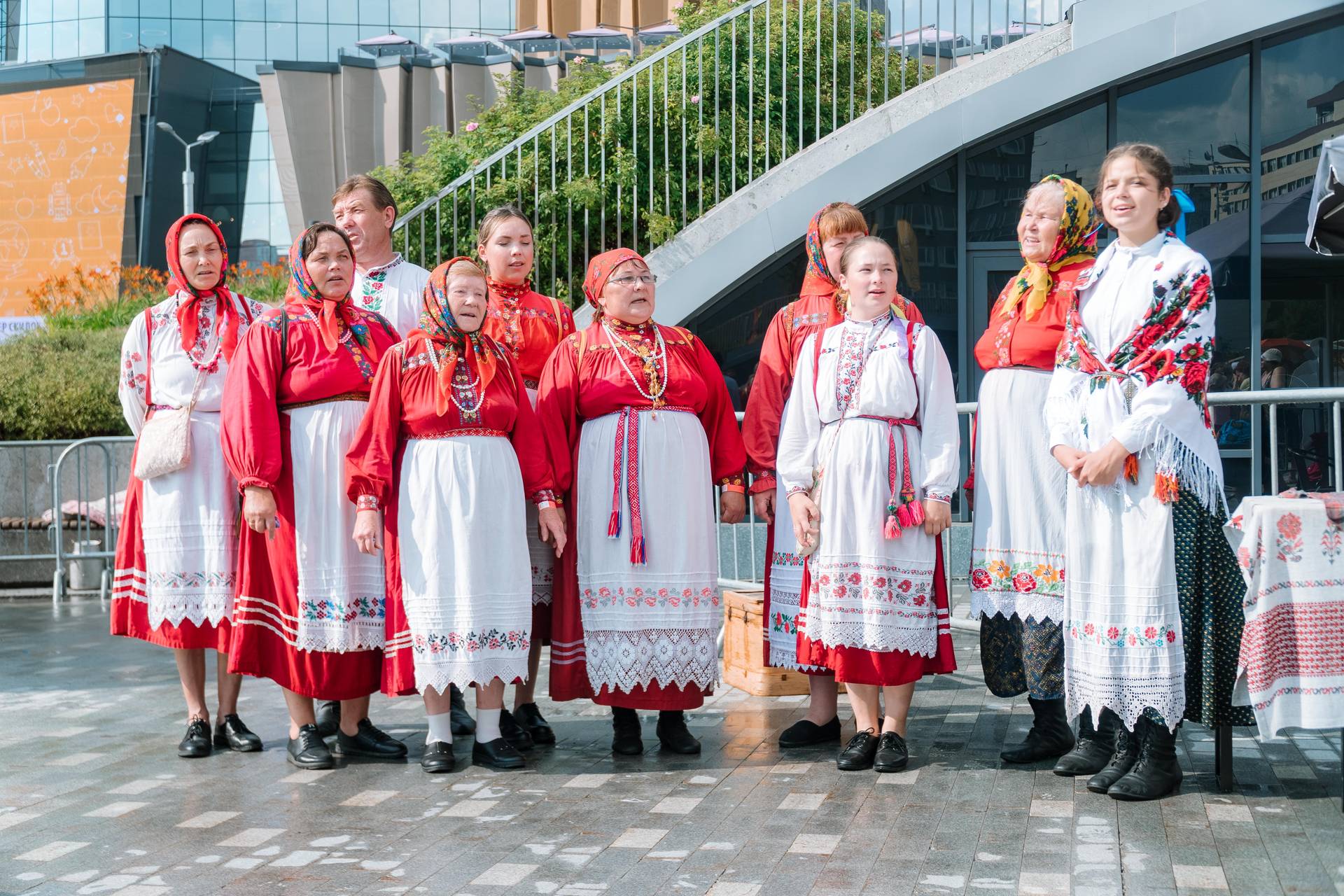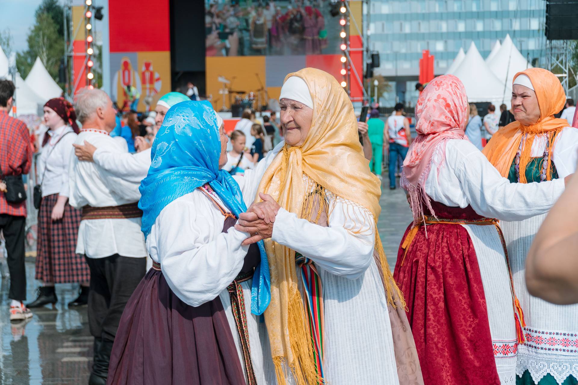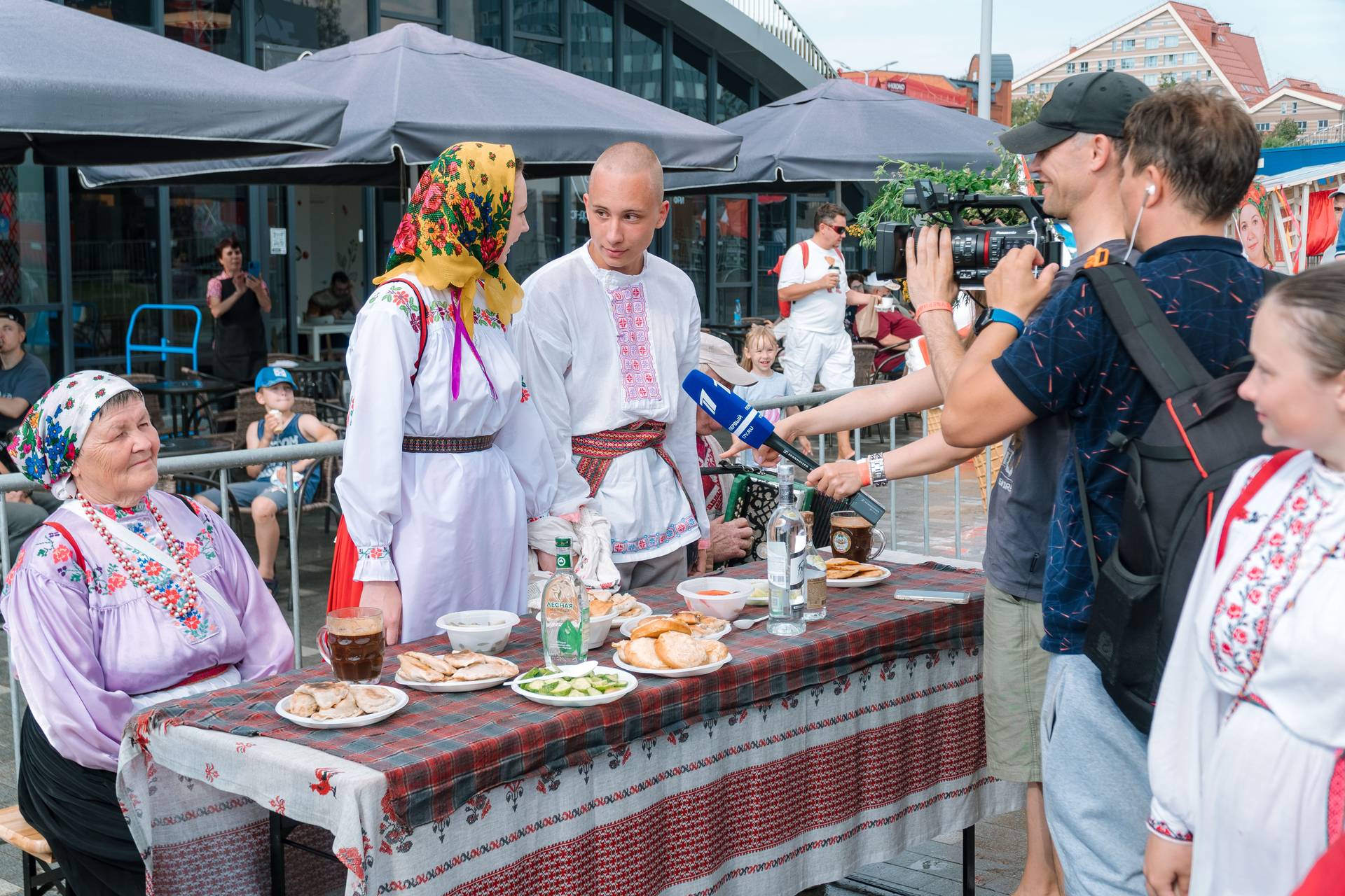 Первый день фестиваля был посвящён свадебной обрядности, было показано несколько фрагментов свадеб — коми-пермяцкой, удмуртской, татарской и русской. Второй день мы посвятили земледельческим обрядам. Как раз начался август, и мы показали фрагменты обрядов, посвящённых началу жатвы, сбору урожая и покосу. Очень живописно смотрелись удмуртские женщины, которые собрались на покос, как положено, взяв с собой бутылку молока и варёные яйца. Когда они расположились на фоне арт-объекта — дерева с сеном и цветами, получилась большая инсталляция, которая была наполнена и соответственным музыкальным материалом. Конечно же, это игра, потому что в центре города никто не собирается косить траву с песнями, но это напоминание о той традиционной культуре, которая ещё помнится старожилами и в каждом из нас отзывается, если просто полистать альбомы с фотографиями, потому что это не археологическая культура, а культура, которая живёт в памяти наших современников и существует в реальности сельской глубинки.