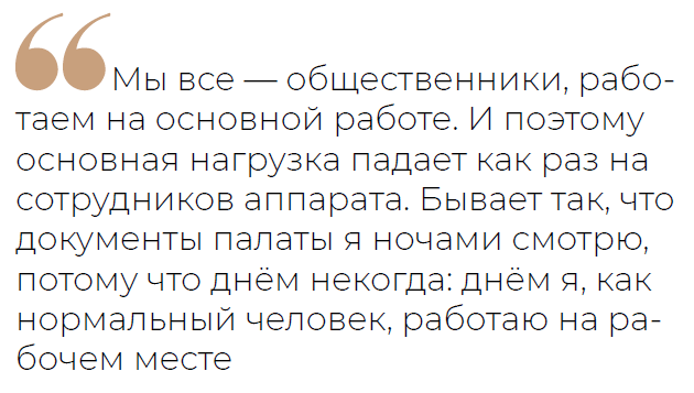 Возможно, что-то поменялось в управлении… Я не была погружена раньше в деятельность палаты, не знаю, как Дмитрий Георгиевич выстраивал внутренние процессы. Но, видя весь объём, вал, срочность, я и сама в это погружена всё время, помимо основной работы. Да, мы все — общественники, работаем на основной работе. И поэтому основная нагрузка падает как раз на сотрудников аппарата. Бывает так, что документы палаты я ночами смотрю, потому что днём некогда: днём я, как нормальный человек, работаю на рабочем месте.
