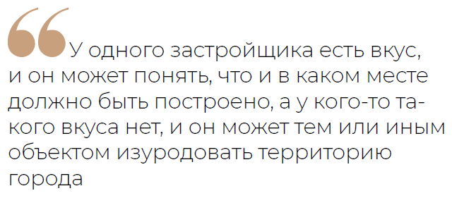 — У одного застройщика есть вкус, и он может понять, что и в каком месте должно быть построено, а у кого-то такого вкуса нет, и он может тем или иным объектом изуродовать территорию города.