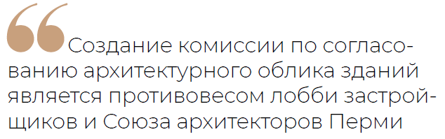 По мнению Александра Михайлова, создание комиссии по согласованию архитектурного облика зданий является противовесом лобби застройщиков и Союза архитекторов Перми. Однако вопрос в том, кто войдёт в состав такой комиссии, отмечает он.