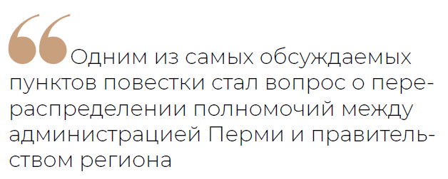Одним из самых обсуждаемых пунктов повестки стал вопрос о перераспределении полномочий между администрацией Перми и правительством региона.