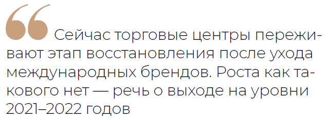 — Сейчас торговые центры переживают этап восстановления после ухода международных брендов. Роста как такового нет — речь о выходе на уровни 2021—2022 годов. Явно виден этап развития и усиления, качественного изменения российских брендов в лучшую сторону. Избытка свободных арендных площадей мы не ощущаем, но есть несоответствие намерений владельцев торговых центров (концепция, перечень брендов, ставки, условия) и готовности потенциальных арендаторов. Постепенно площади заполняются, и, полагаю, размер вакансий вскоре вернётся к уровню 3—5%. Трафик до уровня 2019 года не восстановился нигде по стране, но наш торговый центр в 2022 году точно показал положительную динамику по трафику. Определённую насторожённость и приостановку развития вызвала ситуация нынешнего августа с курсами валют.