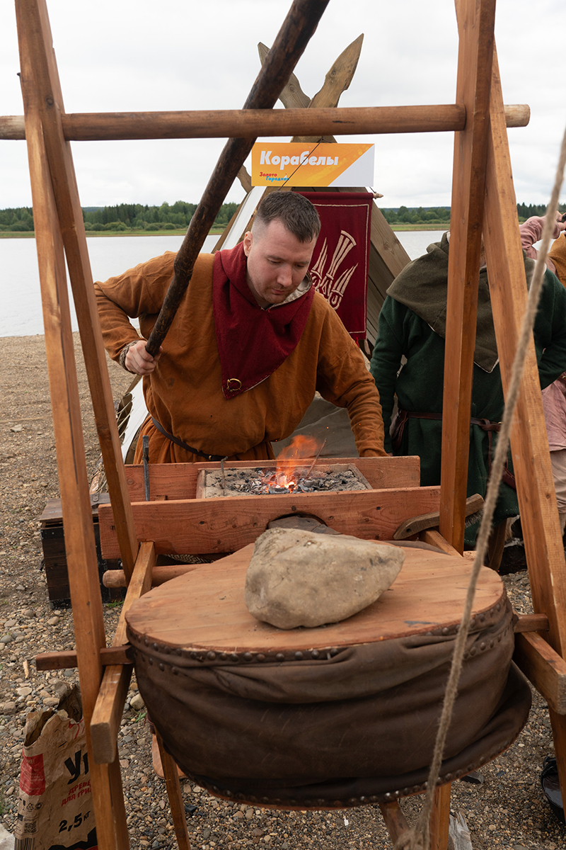 — Обычно, когда затрагивают тему Ермака, любят представлять себе какие-то парадные вещи, казачью удаль победы… Но Ермак — это прежде всего первооткрыватель, он шёл неизвестно куда неизвестной дорогой, это был очень трудный и тяжёлый поход. Тем дороже была его победа и его открытие. Чтобы понять, что это было и чего стоило, мы пригласили реконструкторов, которые специализируются на этом историческом периоде, ребят из клуба «Кречет» из Сыктывкара, которые занимаются реконструкцией корабельных историй и знают, как строились струги, каким инструментом, из какого дерева… Как всё в реальности происходило, какие были наконечники у стрел, из чего лили пули, нам показал известный пермский реконструктор-литейщик Дмитрий Прокуроров. Настоящий воинский мастер-класс устроили пермские реконструкторы — клуб «Уральские белки», они показали, как муштровали солдат, собираясь в поход, как стреляли из мушкета. Клуб исторической реконструкции «Хлыновская застава» из Кирова помог нам показать, как чеканили изделия из металла, и развернул на фестивале средневековую кухню: они отлично знают, из чего в Средневековье готовили еду, как обходились без соли, которой было мало… Всё такое подлинное!