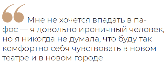 — Мне не хочется впадать в пафос — я довольно ироничный человек, но я никогда не думала, что буду так комфортно себя чувствовать в новом театре и в новом городе. Когда я соглашалась на эту работу, мне в качестве напутствия говорили, что мне будет необходимо обеспечить комфортную атмосферу внутри творческих коллективов в театре; но у меня ощущение, что здесь абсолютно спокойно и люди готовы — всё-таки выйду на пафос! — к созидательной работе, к творчеству.