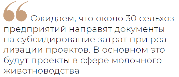 Ожидаем, что около 30 сельхозпредприятий направят документы на субсидирование затрат при реализации проектов. В основном это будут проекты в сфере молочного животноводства. Прогнозно общий объём привлечённых средств в АПК по этому направлению составит порядка 2 млрд руб.
