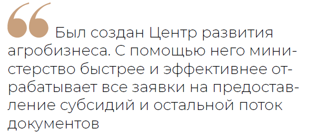 Я считаю, что результат есть. Одно из самых значимых изменений — господдержка в виде субсидии аграриям предоставляется не в два этапа, весной и осенью, а сразу в полном объёме перед началом посевных работ, когда предпринимателям нужны средства на приобретение семян, подготовку техники к весенне-полевым работам и так далее. Мы довольно долго к этому шли, так как потребовалась корректировка большого количества нормативных актов, и наконец в этом году нам удалось это сделать. Также был создан Центр развития агробизнеса, с которого мы начали разговор. С помощью него министерство быстрее и эффективнее отрабатывает все заявки на предоставление субсидий и остальной поток документов. Однако всегда есть над чем работать. Перед нами поставлена задача, которая находится на контроле у главы региона: на будущий год держать заданную планку организации работы и продолжать в том же темпе.