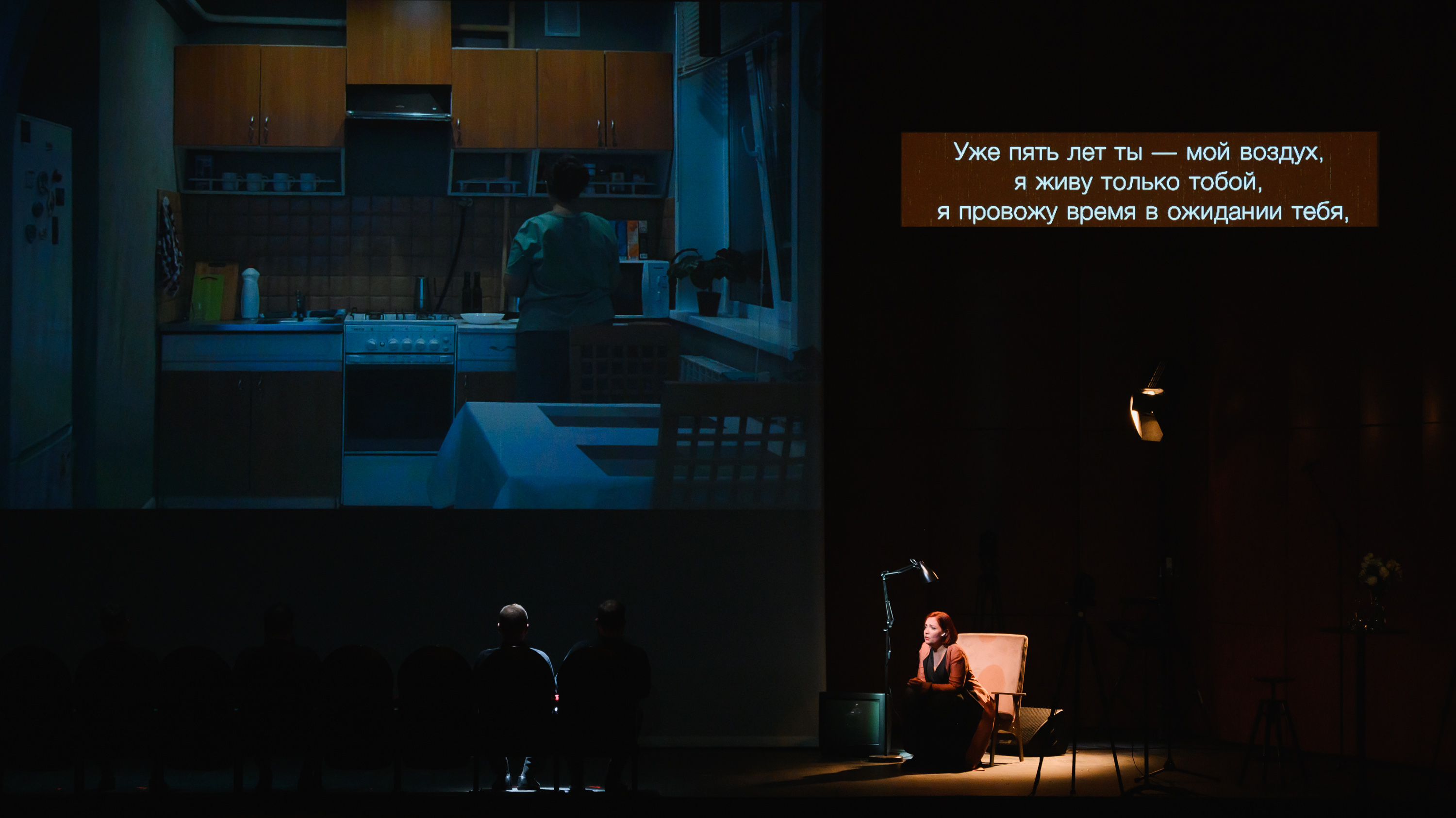 Эти наушники — не случайная деталь. Они недвусмысленно указывают на ещё одно выдающееся произведение искусства, которое аккуратно вписано в контекст спектакля, — фильм Педро Альмодовара «Человеческий голос» с Тильдой Суинтон в главной роли. Это очень важное напоминание. Дело не только в том, что создатели спектакля прекрасно понимали, с кем и с чем их будут сравнивать, и разместили на сцене своеобразный дисклеймер: «Да, мы помним про Альмодовара!», дело ещё и в том, что они солидарны с испанским режиссёром в прочтении этого сюжета.