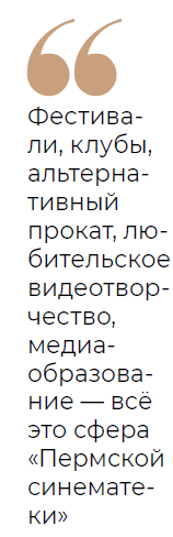 Фестивали, клубы, альтернативный прокат, любительское видеотворчество, медиаобразование и множество других видов деятельности, связанных с кино, — всё это сфера «Пермской синематеки».