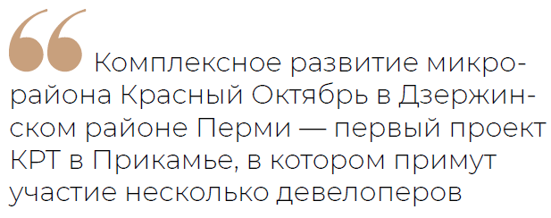 Комплексное развитие микрорайона Красный Октябрь в Дзержинском районе Перми — первый проект КРТ в Прикамье, в котором примут участие несколько девелоперов. Проектом предусмотрена застройка участков общей площадью около 29 га вдоль новой автомагистрали по ул. Строителей. На месте промзон и складов появится более 40 тыс. кв. м жилья, школа на 1 тыс. мест, детские сады, спорткомплексы, сквер, магазины и другие объекты.