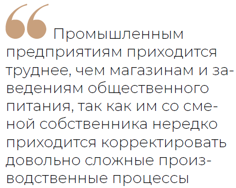 Вместе с тем руководитель реготделения «Деловой России» отмечает, что в некоторых аспектах промышленным предприятиям приходится труднее, чем магазинам и заведениям общественного питания, так как им со сменой собственника нередко приходится корректировать довольно сложные производственные процессы. «Понятно, что материалы и ингредиенты, которые ранее поставлялись из Европы, теперь приобрести проблематично. Нужно искать аналоги на азиатских рынках, а так как полные аналоги бывают редко, то так или иначе требуется немного менять рецептуру или создавать совсем новые продукты. Также сложности могут возникнуть у предприятий, которые используют европейское оборудование. Производители техники, вероятнее всего, в обслуживании сегодня откажут. Остаётся либо налаживать производство запчастей в России, либо приобретать оборудование и комплектующие к нему в Азии. Конечно, многим пришлось перестраивать свою работу. Это именно то, чем занимаются российские предприятия в последние полтора года. На мой взгляд, у них это неплохо получается. Главное, что компании, в том числе сменившие собственников, продолжают работать и стараются сохранять ассортимент продукции», — резюмировал Дмитрий Теплов.