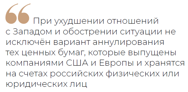О том, что развитие ситуации непредсказуемо, говорит и Эдуард Матвеев. Российский фондовый рынок впервые работает в период СВО и под достаточно серьёзными санкциями. Эксперт полагает, что при ухудшении отношений с Западом и обострении ситуации не исключён вариант аннулирования тех ценных бумаг, которые выпущены компаниями США и Европы и хранятся на счетах российских физических или юридических лиц. По его словам, всё зависит от того, как будет развиваться политическая ситуация.