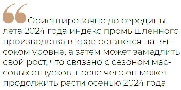 Дмитрий Баранов прогнозирует, что до конца года индекс промышленного производства в регионе может оставаться на высоком уровне за счёт ранее набранных темпов и сохранения мер поддержки экономики со стороны государства. «Некая просадка индекса может быть в начале 2024 года, что связано с новогодними каникулами и уходом части экономически активного населения в отпуск в январе-феврале. С весны 2024 года индекс промышленного производства в регионе может начать расти благодаря оживлению экономики, росту спроса на товары и услуги, сокращению складских запасов. Ориентировочно до середины лета 2024 года индекс промышленного производства в крае останется на высоком уровне, а затем может замедлить свой рост, что связано с сезоном массовых отпусков, после чего он может продолжить расти осенью 2024 года», — рассуждает эксперт УК «Финам Менеджмент».