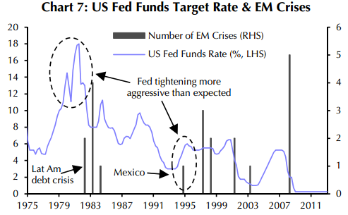 Подобные ситуации возникали в начале 80-х в Латинской Америке, после того как Пол Волкер задушил инфляцию подняв ставку ФРС до 20%. Затем была рецессия начала 1990-х, после чего в 1994 году случился “Tequila crisis”. Также в 1994 году случился обвал рынка рискованных и длинных безрисковых облигаций, с которым пытались сравнивать недавние события мая-июня.