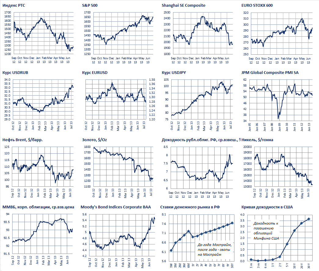 МВФ вчера уточнил прогноз развития мировой экономики. Ожидается, что темпы роста в 2013 году будут “заниженными”, на уровне чуть больше 3%. В 2014 году предсказывается глобальный рост на уровне 3.75%. Обе цифры на 1/4 процента ниже апрельских прогнозов. Причина - спад в зоне евро продолжается дольше ожиданий, а также замедляются развивающиеся экономики. России предсказывается 2.8% и 3.6% в 2013 и 2014 годах, соответственно.