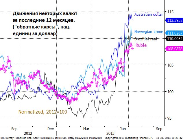 График сравнивает движения курсов валют в ходе беспокойства по поводу “сведения на нет QE” в мае - июне. Вряд ли можно сказать, что рубль хуже других валют. Скорее наоборот.