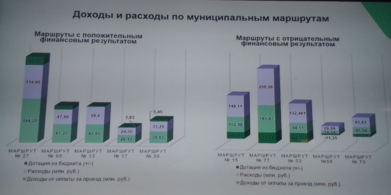 В топе самых востребованных маршрутов оказались № 12, 17, 27, 56 и 68. Они показали положительный финансовый результат. Путин пояснил, что такие маршруты характеризуются высокой сменяемостью пассажиров с небольшой длиной поездки. При этом на автобусных маршрутах, где большая длина пути (автобусы, которые курсируют в отдалённые районы города) и низкая сменяемость пассажиров, показывают отрицательный финансовый результат. Это автобусы № 15, 32, 58, 73 и 77.